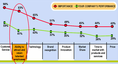 The Grant Thornton survey of senior management in 417 leading businesses reveals that 83% of these companies feel the ability to attract & retain talented employees is one of the most important drivers of competitive advantage, second only to customer service. |